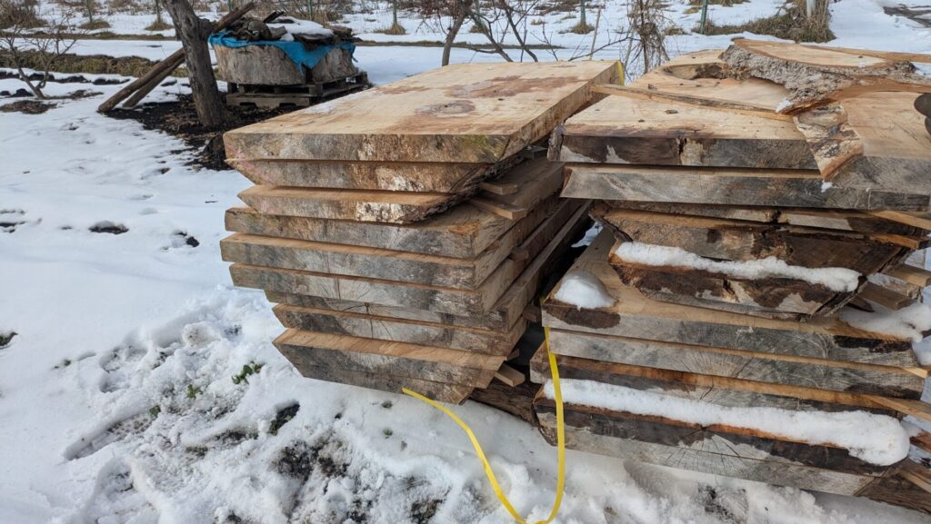 一番たまは全く杢なし、二番たまは穴だらけ。直径4尺(1200ミリ)あったが製材機の有効幅が1メートル、しかも曲がっていたのでほとんど二尺五寸(750mm)幅にひかれ2万で買った丸太が賃挽き代は7万と残念な結果でした。